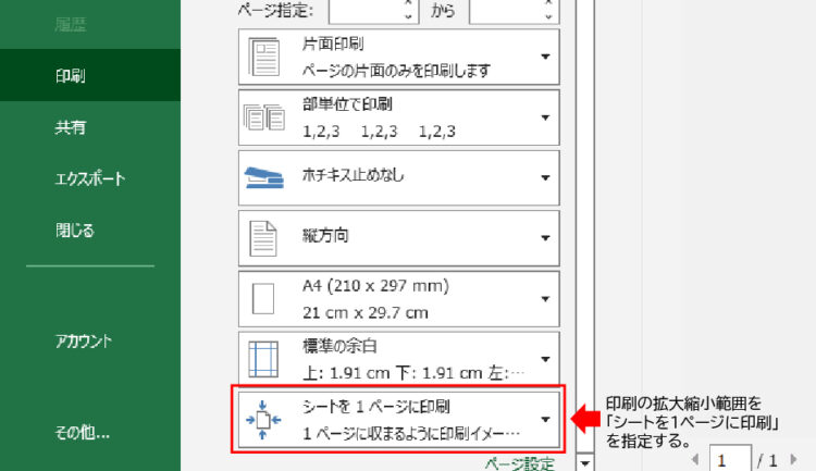 印刷オプションの拡大縮小範囲を「シートを1ページに印刷」を選択し、